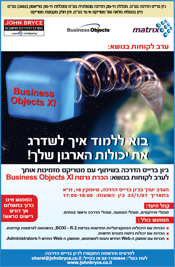 בתאריך 22/01/2007 יערך ערב לקוחות בנושא Business Objects XI . ערב הלקוחות יערך בג'ון ברייס הדרכה, טיומקין 16 ת"א בין השעות 17:00-19:00.